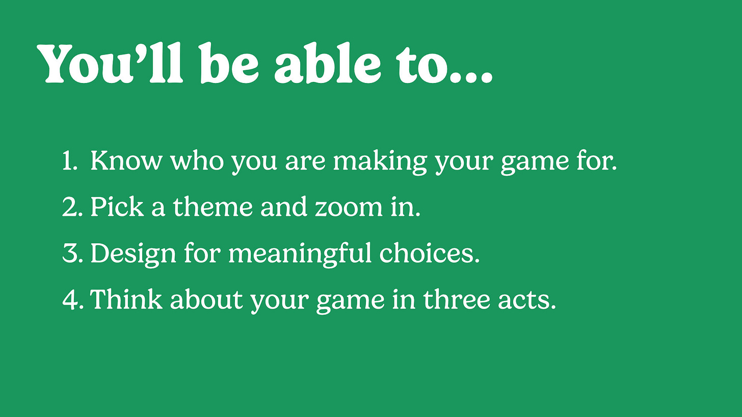My plan was to instead give students just four design principles — core concepts that they could easily understand and immediately implement in their games.