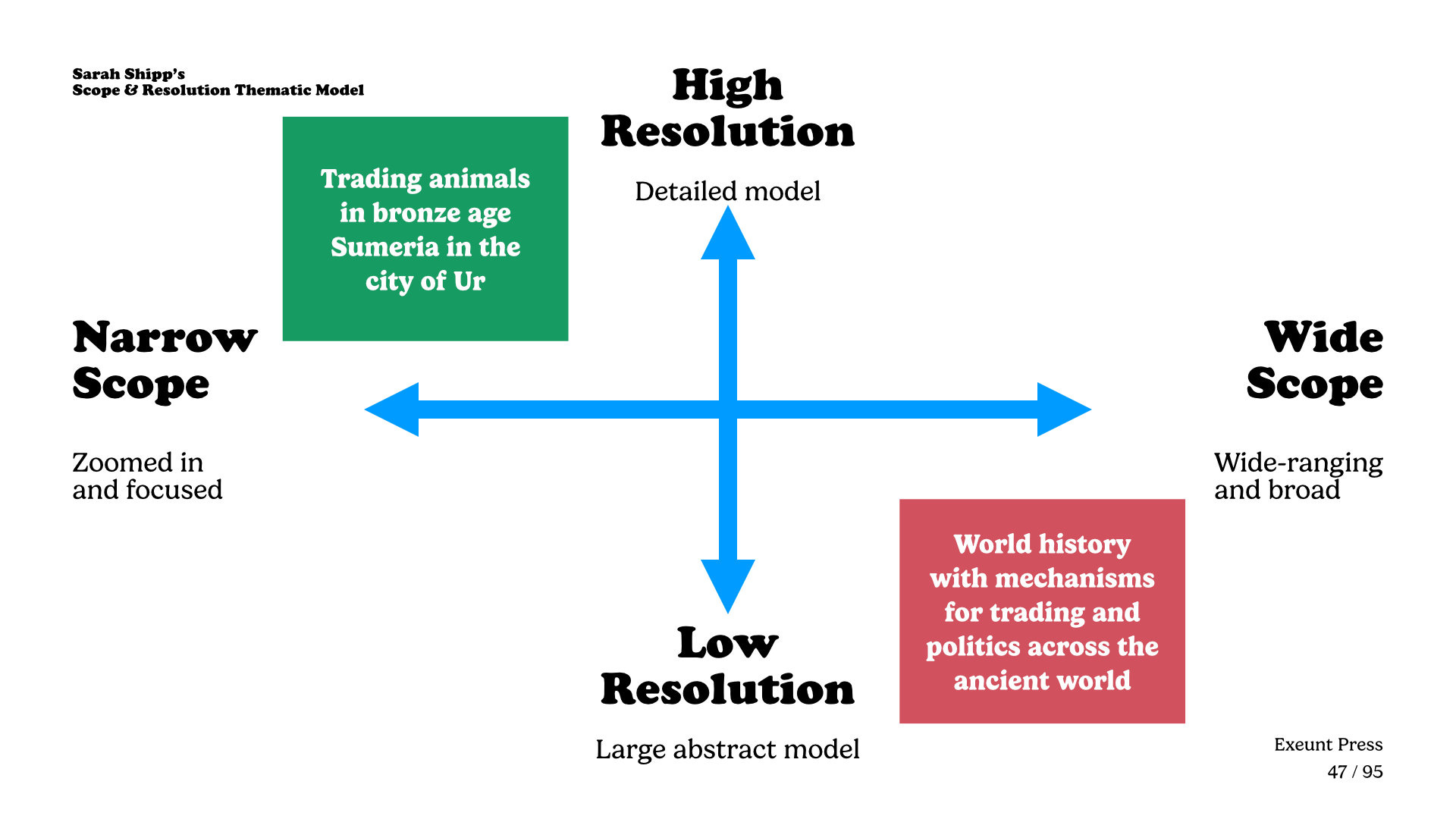 A game can have a narrow or wide scope. Where a game about the entire world has a wide-ranging and broad scope, another game might zoom in and focus on just one neighborhood. Games can be low resolution, abstracting away detail and not burdening players with highly detailed models. Alternatively, they can be high resolution with an extremely detailed model.2