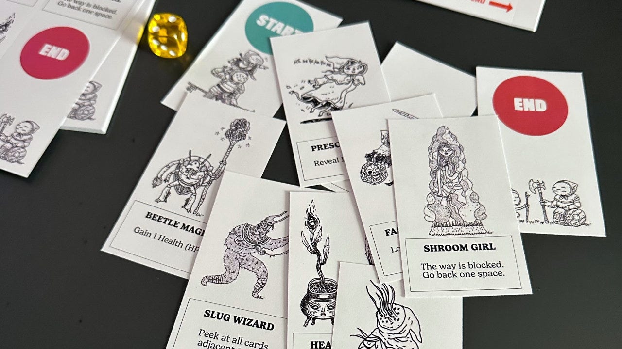 Using some simple cards I made ahead of time, we created a simple dungeon crawler. Your character begins at Start on the left and moves to End on the right. We set up and tried three iterations of the design: