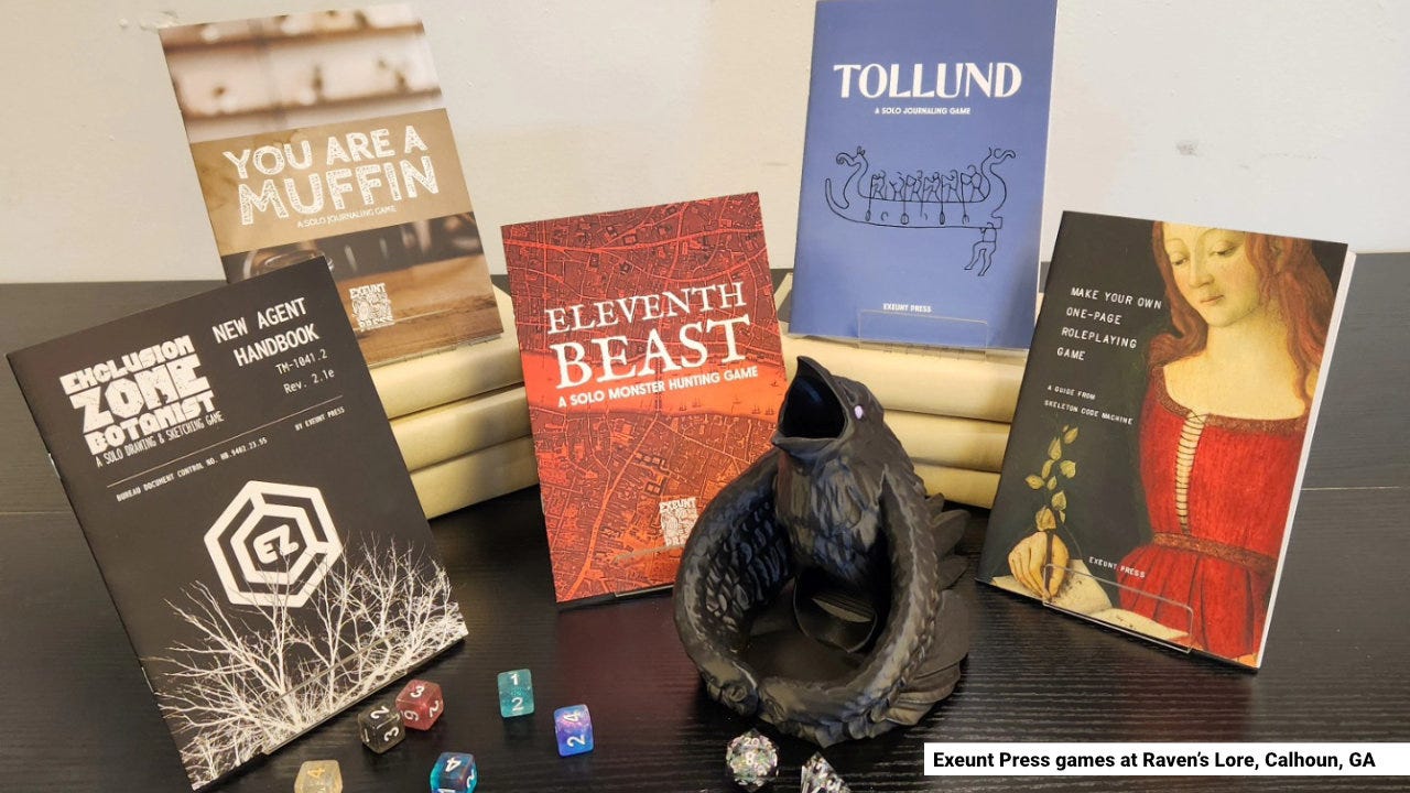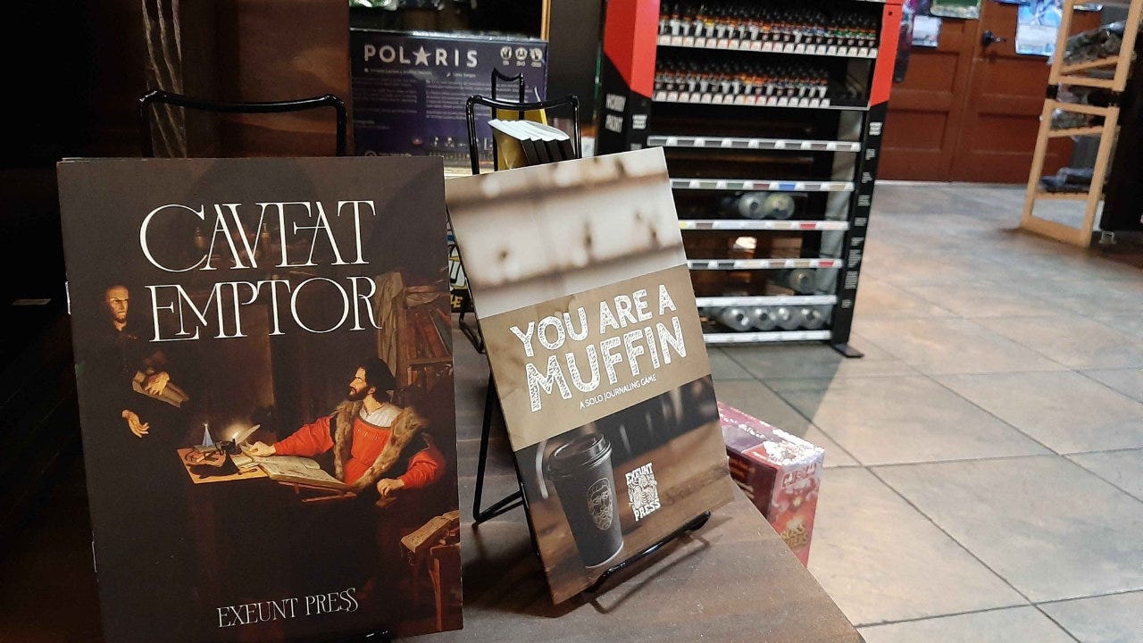 I’d like to feature friendly local game stores that carry Exeunt Press games. If you run a shop or see them in stock, send photos to games@exeunt.press for a chance to see them featured here. 📸