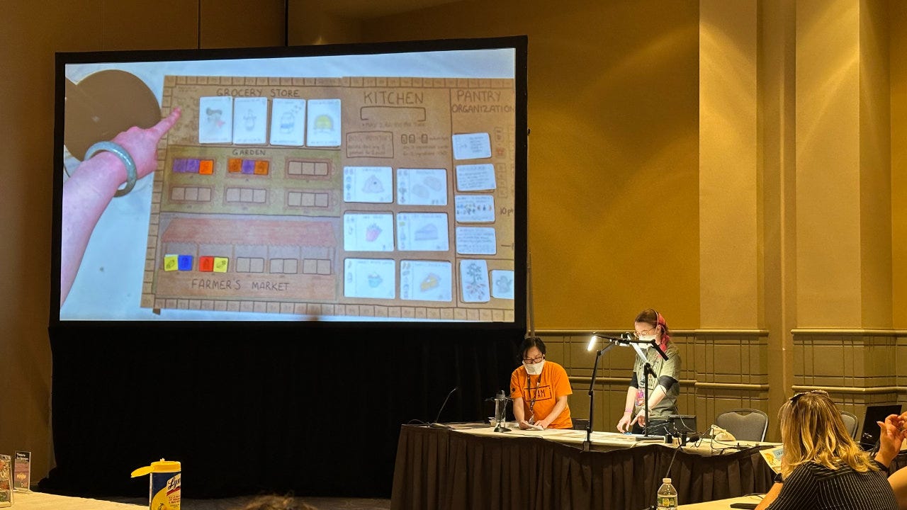 My first experience with Unpub Feedback Frenzy was at the convention in Baltimore earlier this year. I had never seen anything like it and wrote about pitching at Skeleton Code Machine (SCM) to compile some of my thoughts. The PAXU event was the same format with five sets of designers pitching their game to a panel of industry professionals. I took pages of notes and will probably write another SCM article to share the lessons learned.