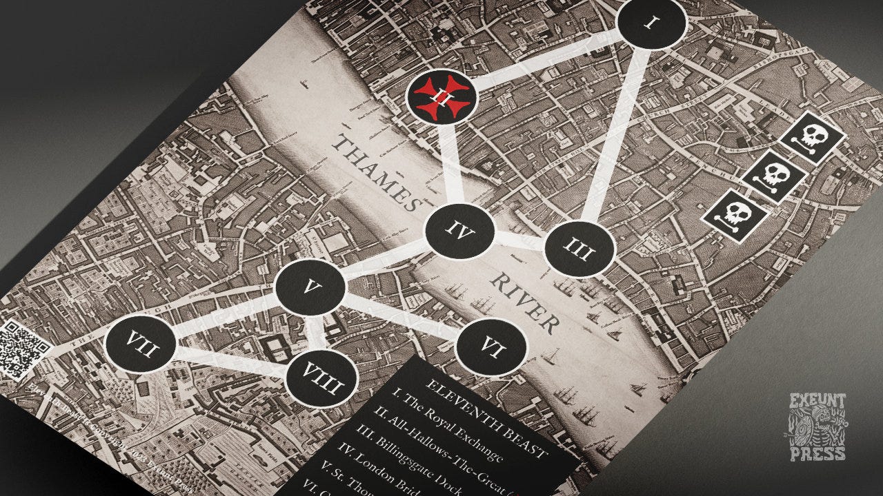 Inspired by Hellboy by Mike Mignola and Fallen by Perplexing Ruins, you will move through 18th century London, using a map of the city as it existed in 1746.